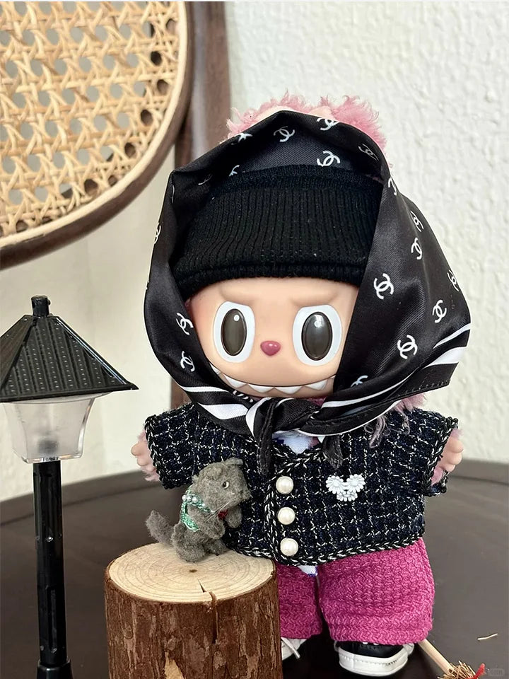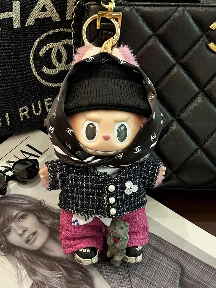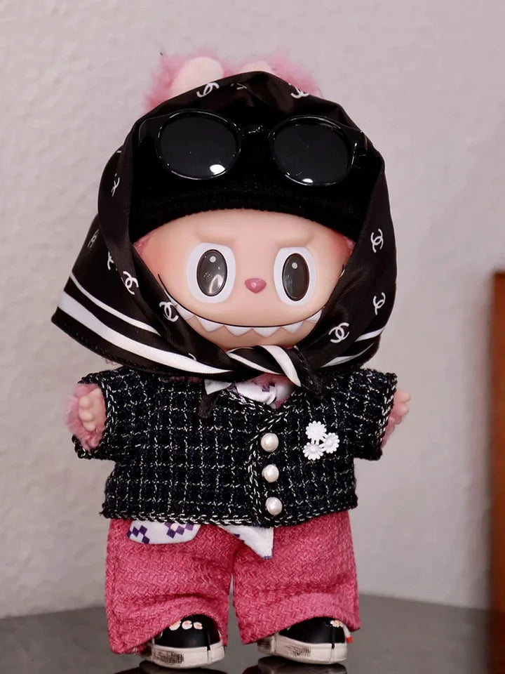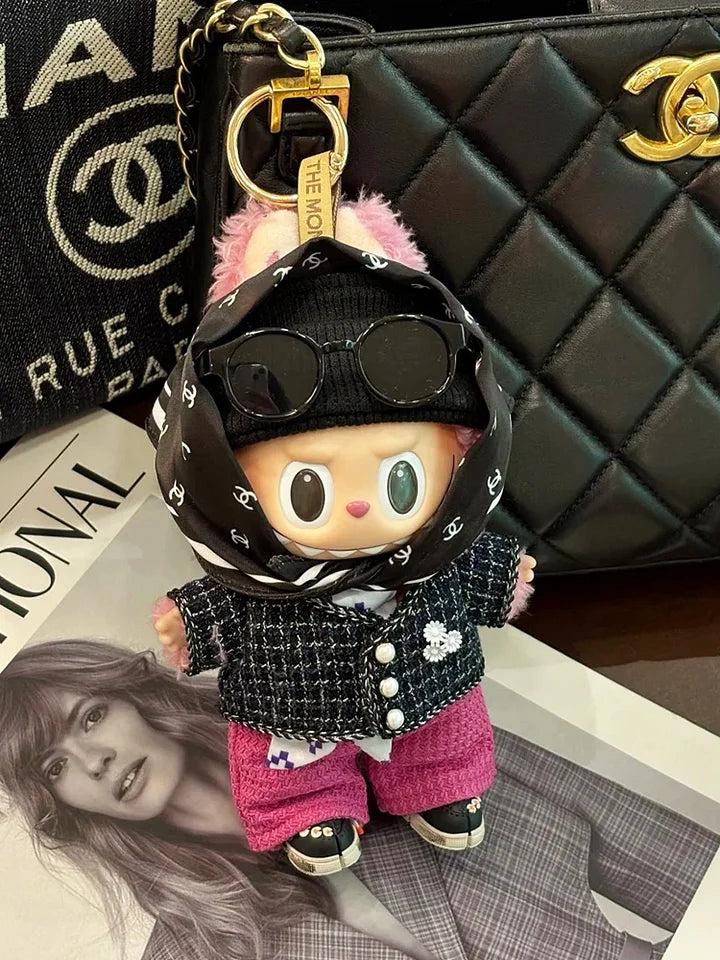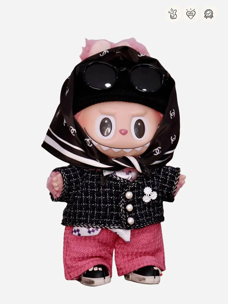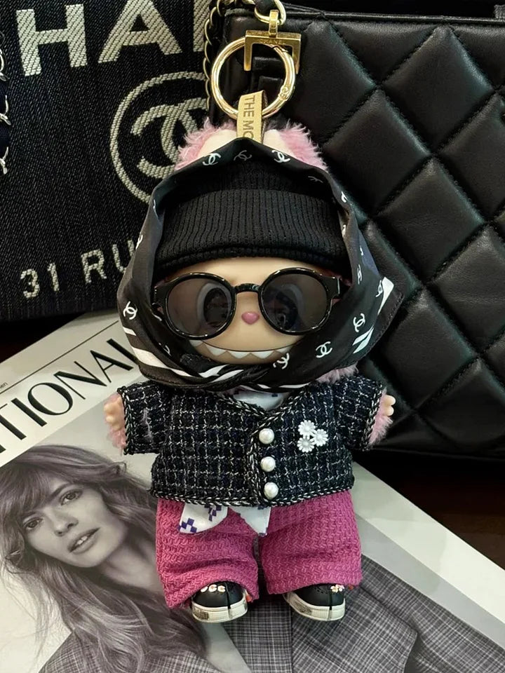Channel ultimate Parisian glam with this [Parisian Chic Set] for your Labubu. Featuring a black logo-patterned scarf, pearl-button tweed jacket, retro round sunglasses, and vibrant pink trousers, this ensemble perfectly blends elegance and bold fashion energy.