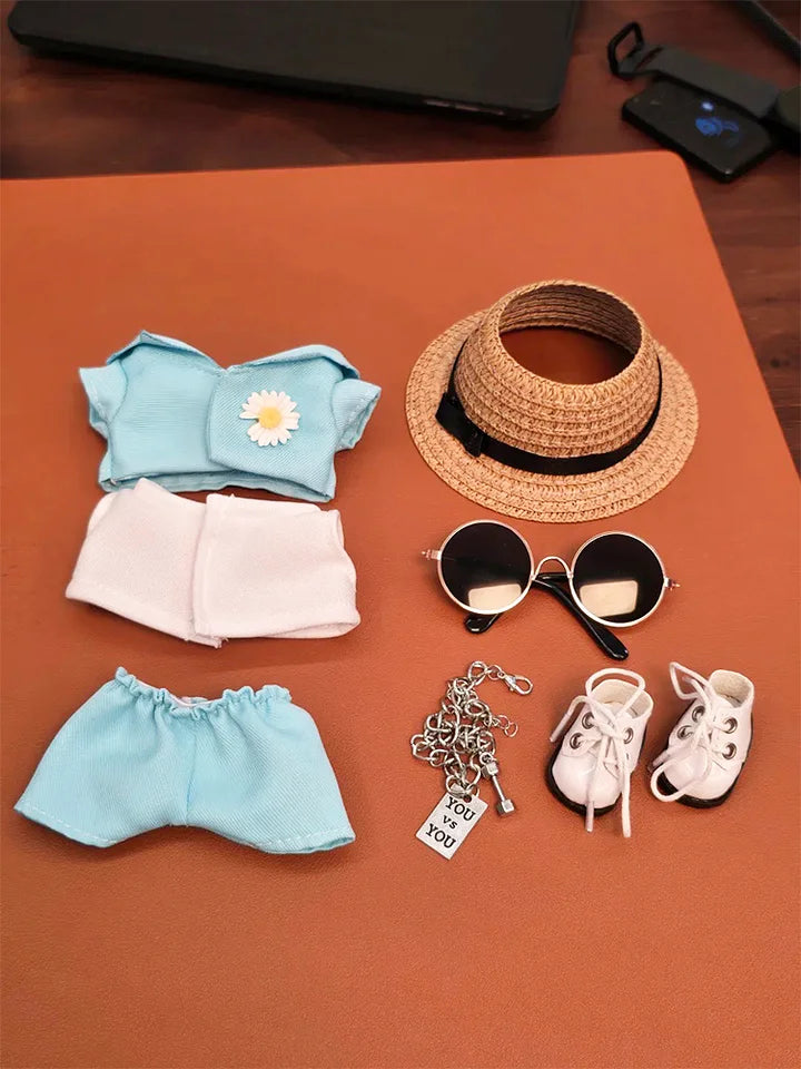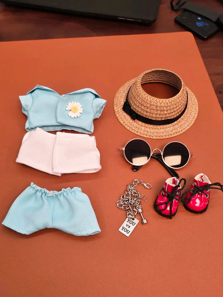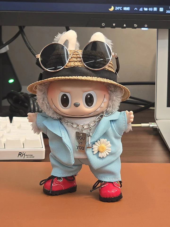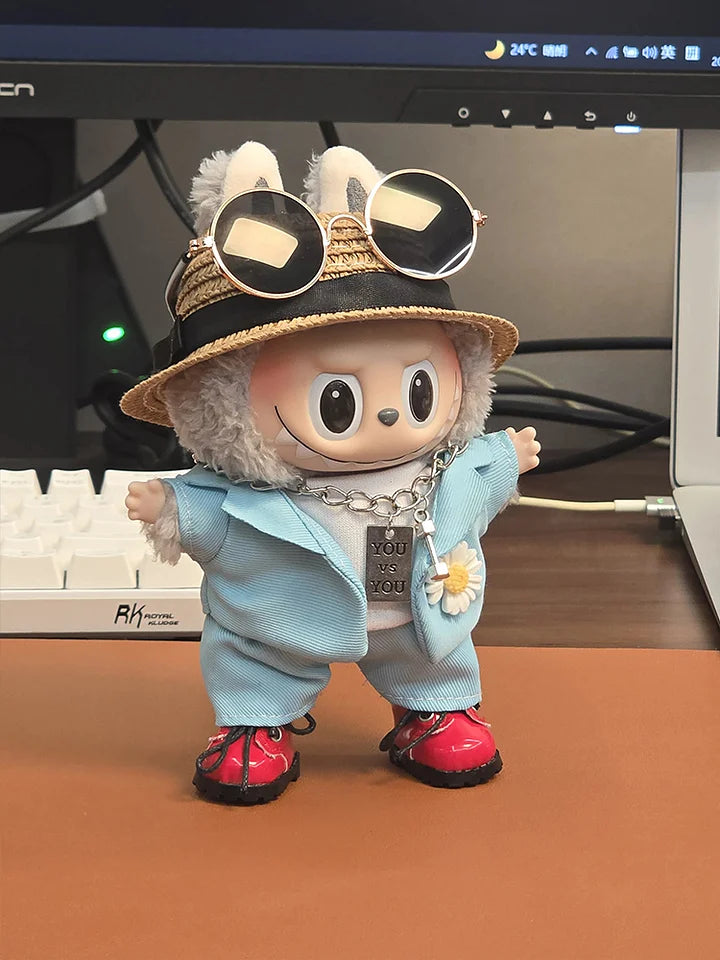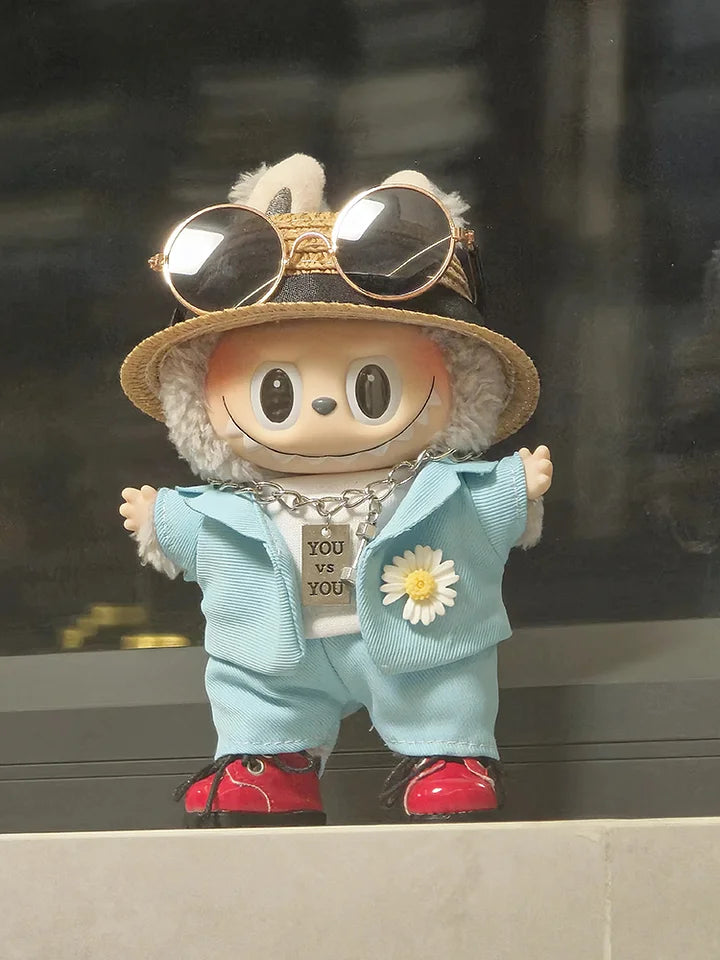 Style your Labubu in this dapper summer outfit and make it the coolest figure on the street! The [Holiday Gentleman Set] features a light blue suit, daisy pin, printed tee, straw hat, sunglasses, chunky boots, and a metal chain necklace โ all designed for playful sophistication and photo-ready vibes.